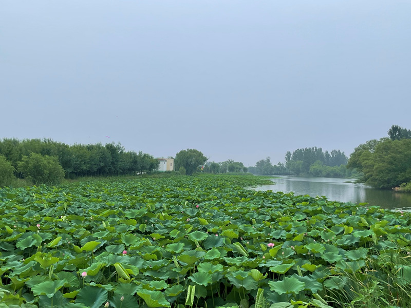 以荷花為主題,堤岸打造木棧道,河岸搭配蘆葦等植物,充分發揮綠地效益。